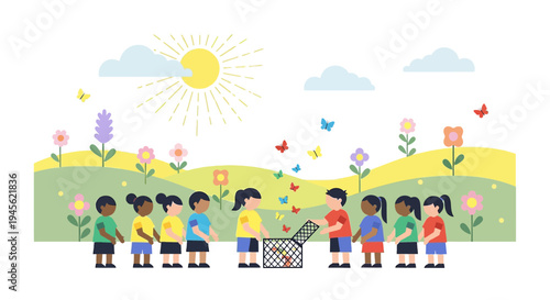 Family having picnic in nature, playing with dog in the park, flat vector isometric illustration. Father, mother and kids spending time together. Family life, relationship. Summer outdoor activity.