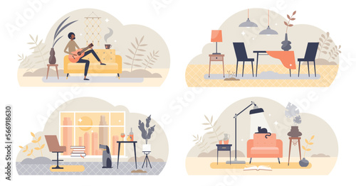 Family repair and remodeling home interior. Concept vector posters set. Couple paint walls and decorate house. People choosing wallpapers in diy store. Apaprtment renovation.