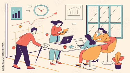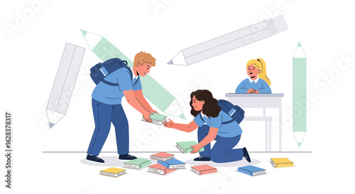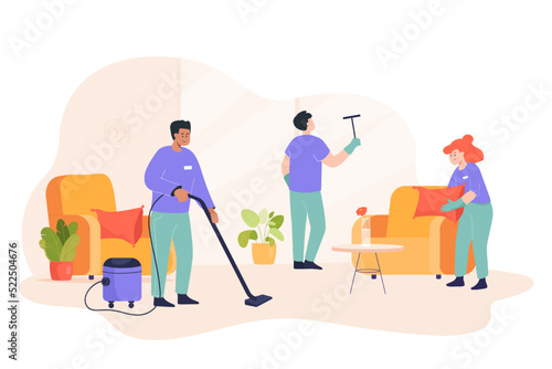 Family repair home and paint walls together. Vector illustration. People wallpapering and painting wall in apartment. House renovation, room decorating, repair apartment.