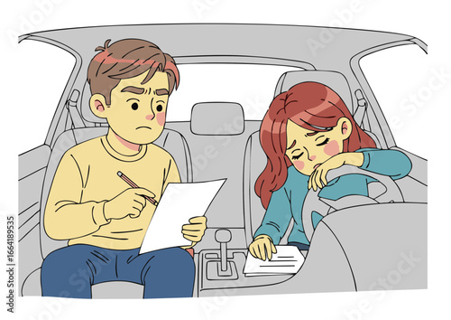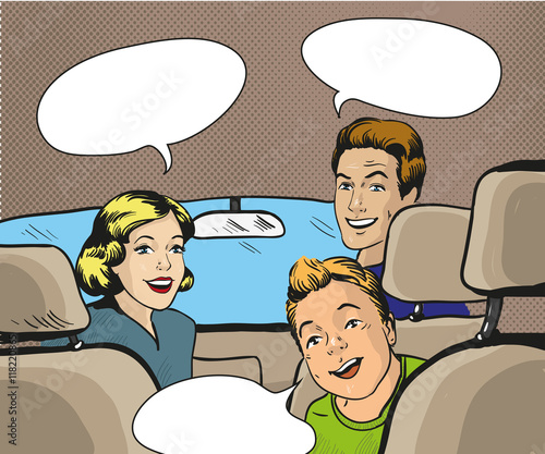 Family sitting in the car looking back. Vector illustration in pop art style, retro comic book. Speech bubble