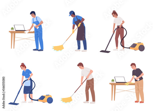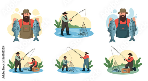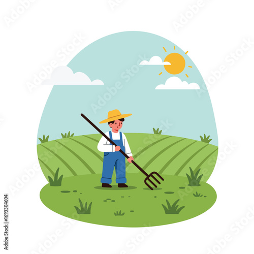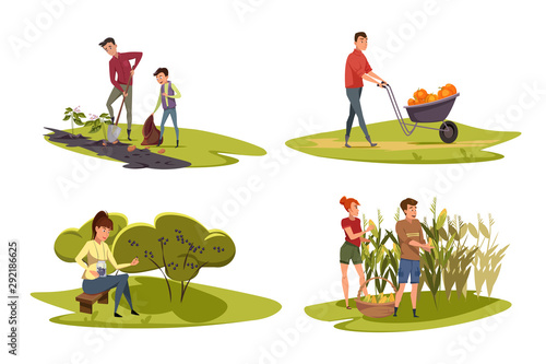 Farm life scenes set. Grass mowing, hay harvesting, planting seedlings isolated vector. People farmer working on farm illustration. Agriculture worker character over rural landscape