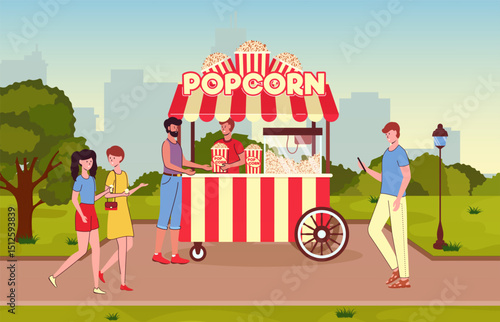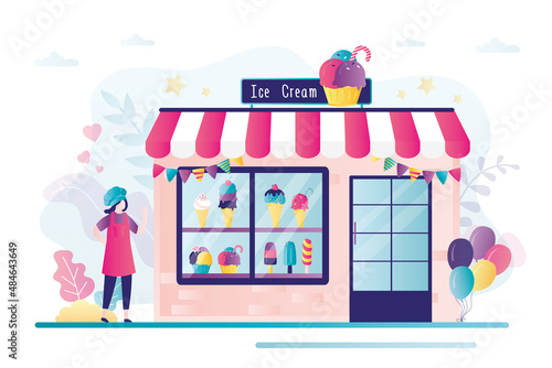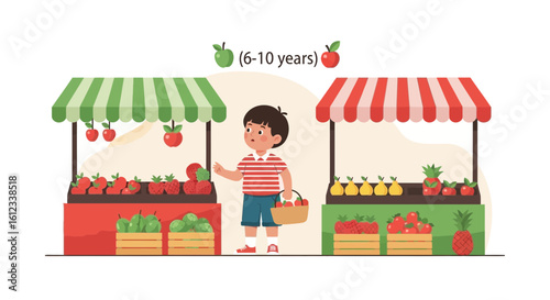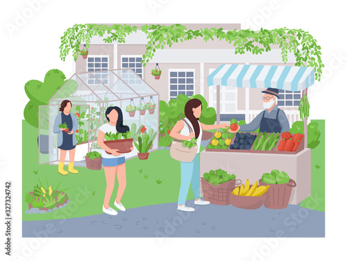 Farmer in local market offers fresh vegetables and grocery in street food stall. Farm marketplace and shop. Concept illustration. Vector web site design template. Landing page website illustration.