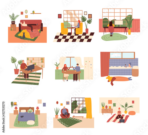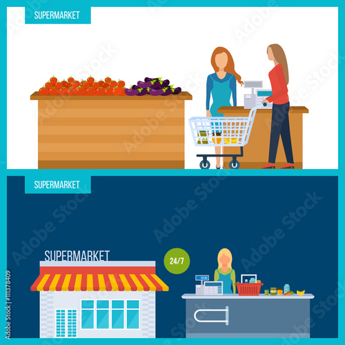 Street market stall, saleswoman, girl buying bananas and cleaning products, man moving cart with grape, vector illustration. Bazar, fruit and vegetable farmers market composition for web banner etc.