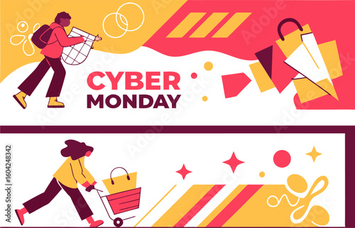 Organic food fresh fruit and vegetable market stall with saleswoman and buyers, vector illustration. Bazar, outdoor grocery store composition for web banner, website page etc.