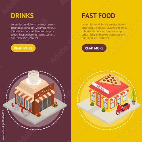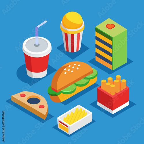 Fast food online concept. Vector isometric smartphone with food delivery app. Pizza, burger, french fries, hot dog, soda popcorn, navigation map with pin marker, buy now button on smart phone screen.