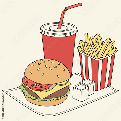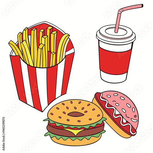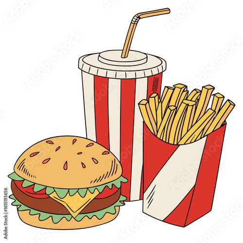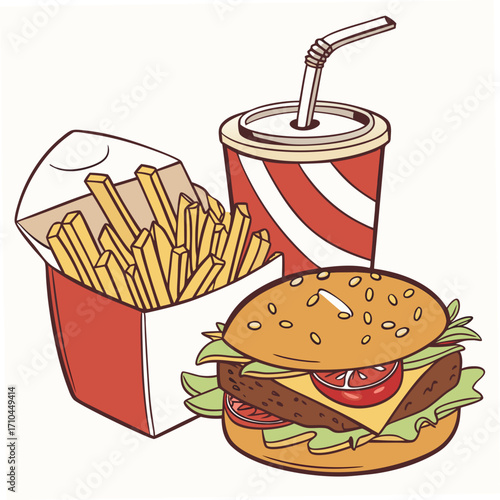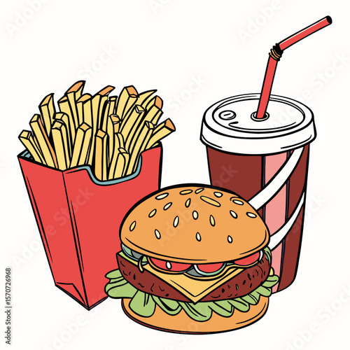 Fast food poster in retro pop art style. Vector comic illustration. Concept graphic background with burger, fries and soda.