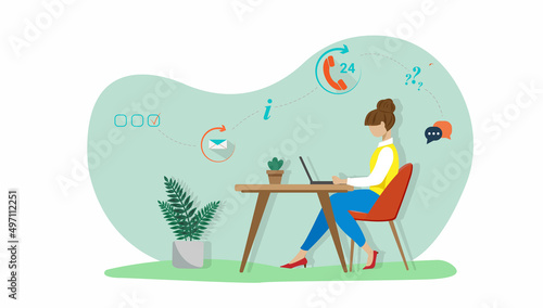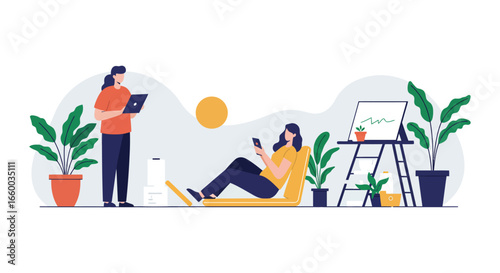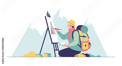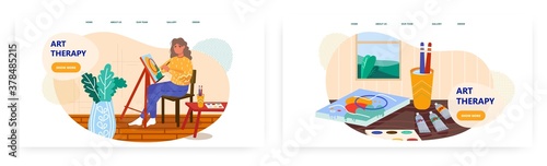 Female artist paints geometric abstract art work. Art therapy concept illustration. Vector web site design template. Paintbrush, palette, canvas, colors. Artist at work.