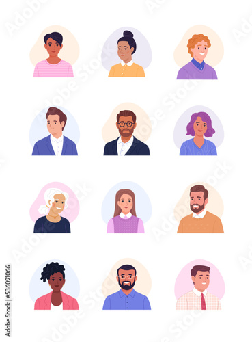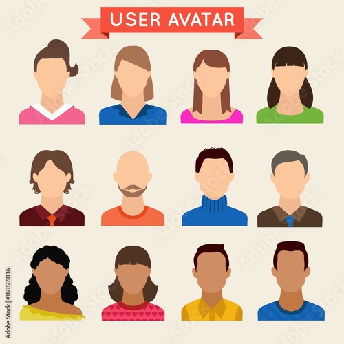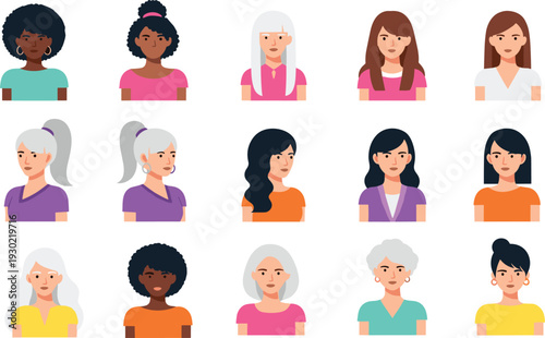 Female avatar icons vector set. People characters in flat style. Design elements isolated on background. Faces with different styles and nationalities.