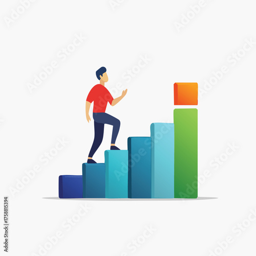 Female boss leader standing on bar chart top and male employee falling down from it, flat vector illustration. Feminism concept.