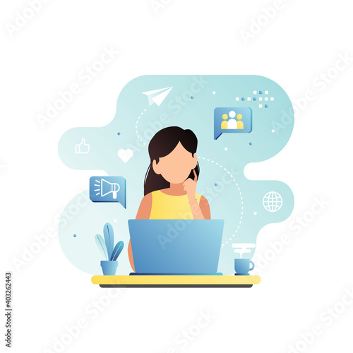 Female writer experiencing creative crisis or block, flat vector illustration. Sad woman sitting at table with clean sheet of paper on it. Creativity crisis, anxiety, fatigue, headache, depression.