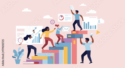 Micro photographers hanging up huge film photos to dry on rope, vector illustration. Film photo printing services concept for web banner, website page etc.