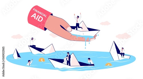 Financial support for business survival concept vector flat illustration. Human hand saving businessman sitting in paper boat from drowning. Financial aid, business bankruptcy.