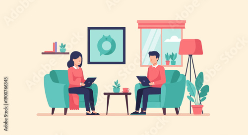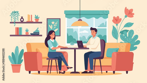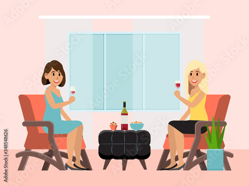 Vector illustration of two young woman having dinner at restaurant. Fine dining concept design element in flat style.