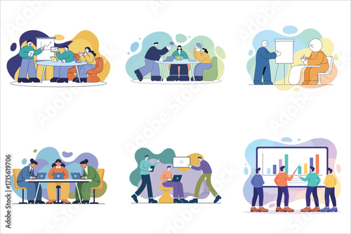 Fired people icon set. Vector flat illustration of sad dismissed former employees because of losing their jobs, employer pointing to the door. Laid-off office workers. Dismissal, unemployment concept.