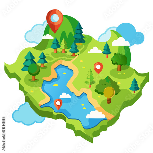 Fish silhouette with fisherman, mountain river, vector illustration in paper art style. Fisher catching fish with fishing rod. Hobby, recreational activity.