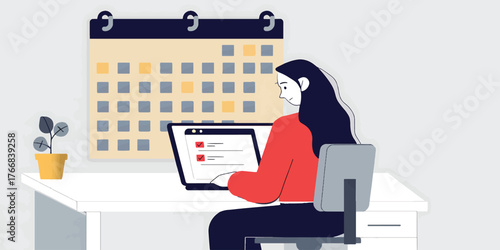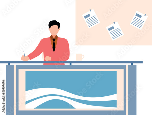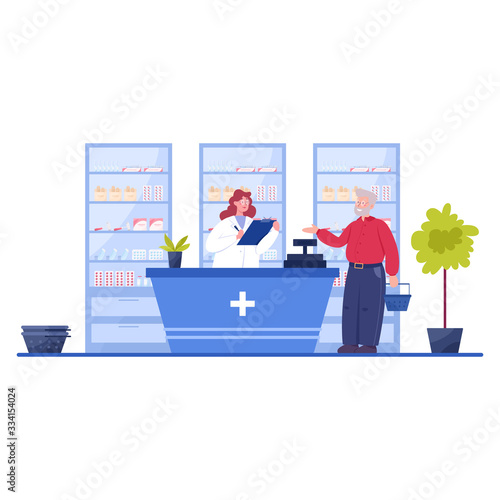 Fish store, flat vector illustration. Saleswoman standing at display fridge counter with fresh and tinned fish. Fishmonger shop, market. Supermarket, grocery store seafood section, department.