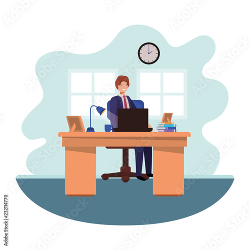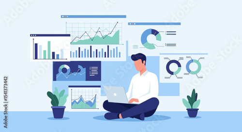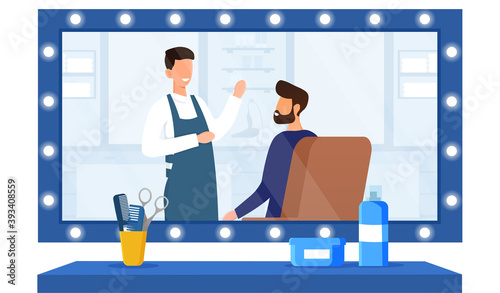 Fish store, flat vector illustration. Saleswoman standing at display fridge counter with fresh and tinned fish. Fishmonger shop, market. Supermarket, grocery store seafood section, department.