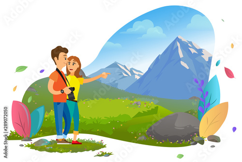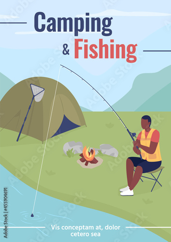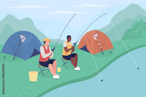 Fisherman using rod catching fish at mountain river bank vector illustration. Fisher man enjoy active lifestyle. Sport hobby and tourism concept