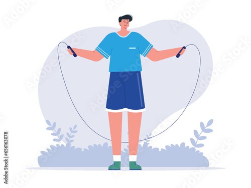 Woman doing exercises with jump rope, vector flat illustration isolated on white background. Skipping rope cardio gym workout, fitness, weight loss, sport activity.