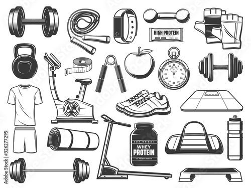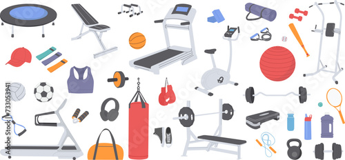 Fitness and workout exercise in gym. Vector set of gym icons in flat style isolated on white background. Gym equipment, dumbbell, weights, treadmill, ball.