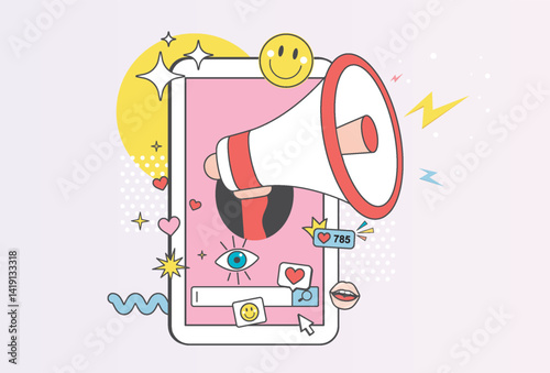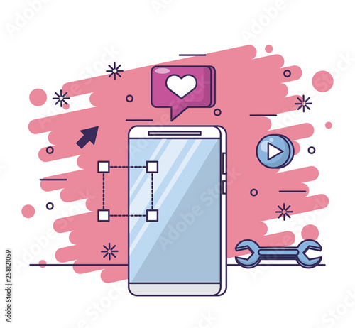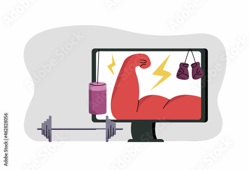 Smart phone with bodybuilder on screen and gym equipment around it, vector illustration. Fitness mobile application mockup concept.