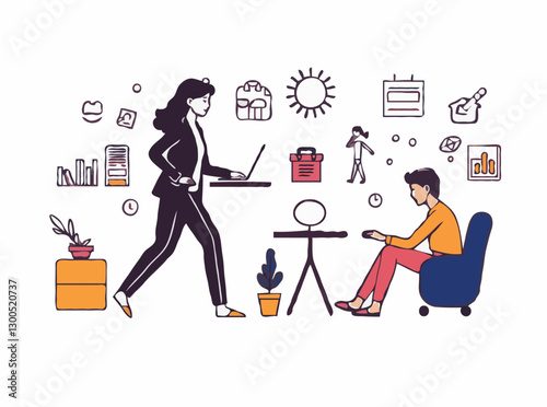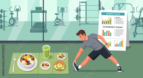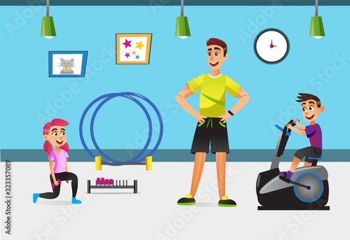 Fitness gym. Young women riding stationary exercise bike, doing kangoo aerobic and pilates exercises, flat vector illustration. Sport and fitness workout. Active and healthy lifestyle.
