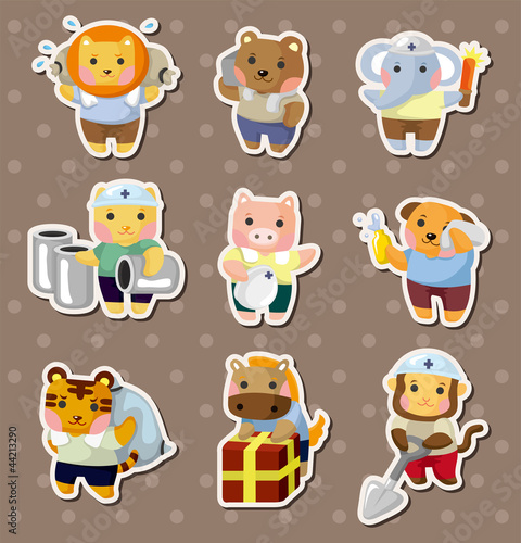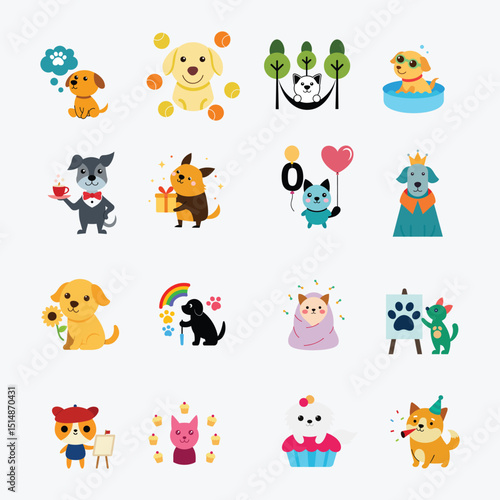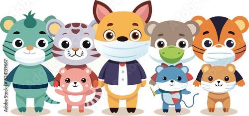 Fitness raccoon panda fox icon set. Vector illustration isolated on white background. Cute animals playing badminton, riding push scooter, exercising with jump rope, hula hoop, dumbbells etc.