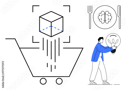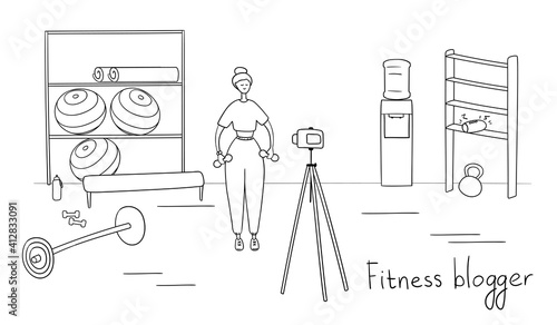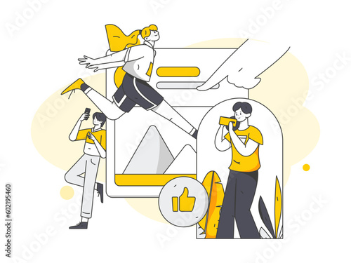 Vector flat illustration of big smartphone with fitness activity tracking app and tiny character cyclist with bicycle. Fitness tracker, smart sports technology concept for web banner, website page.