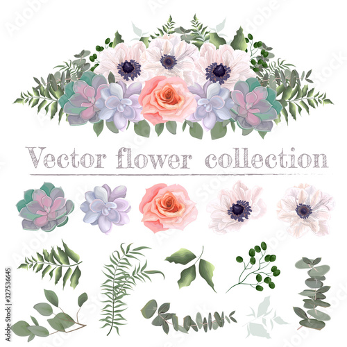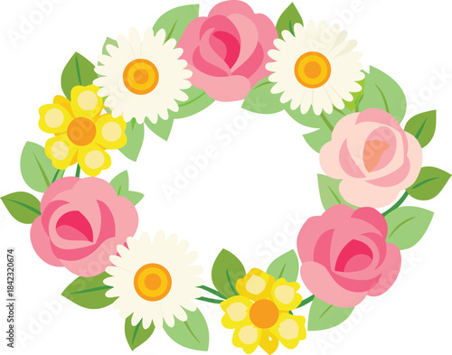 Floral composition set, vector isolated illustration. Bouquets of paper cut craft style pink, yellow roses, white daisy flowers and green leaves. Spring and summer flower arrangements.
