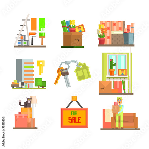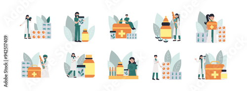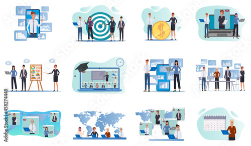 Food delivery set, flat vector isolated illustration. People ordering, chef preparing and courier delivering fast food, pizza, groceries. Online food order. Safe contactless delivery service.