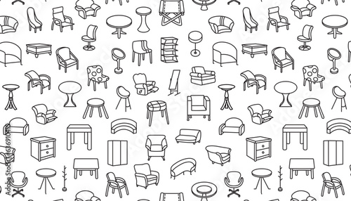 Vector seamless pattern with food delivery symbols, icons. Meal delivery service background, wrapping paper texture thin line art flat style design.