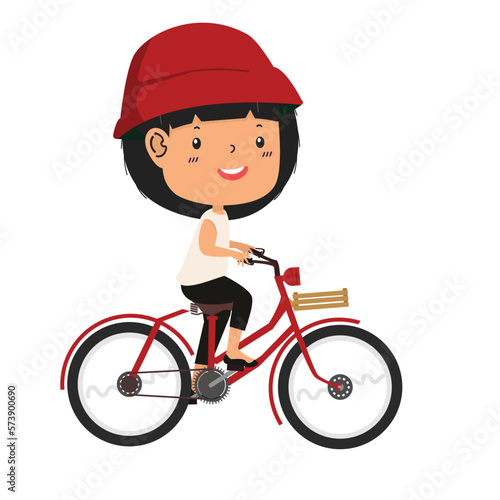 Vector illustration of courier bicycle messenger delivering cardboard box with fast food by bike. Bicycle delivery concept. Food people flat style design element, icon isolated on white background.
