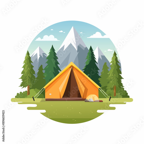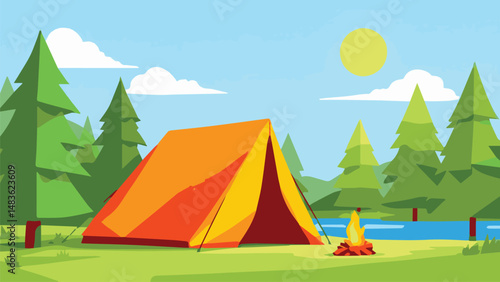 Forest and camp tent illustration. Outdoor travel vector. Picnic on nature. Campsite and adventure landscape. Sport journey trip, scout vacation and tourism