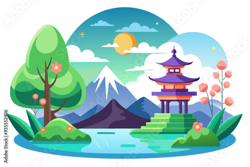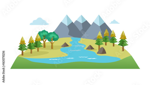 Summer forest camping background paper art style. Camp on river 3d vector design over mountain banner. Travel poster. Adventure on nature