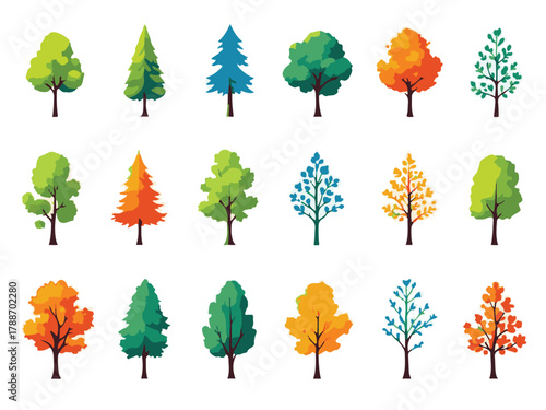 Trees and bushes set, flat vector isolated illustration. Forest, garden trees, shrubs covered with green, yellow, red leaves and stripped of their leaves.