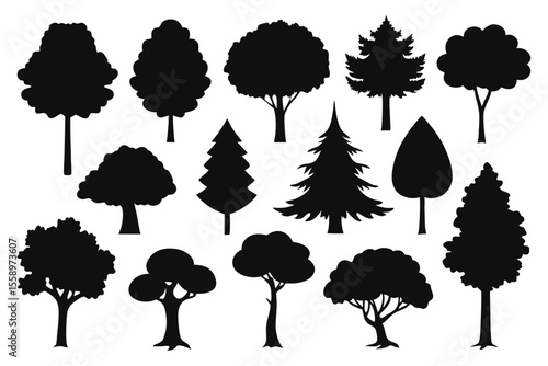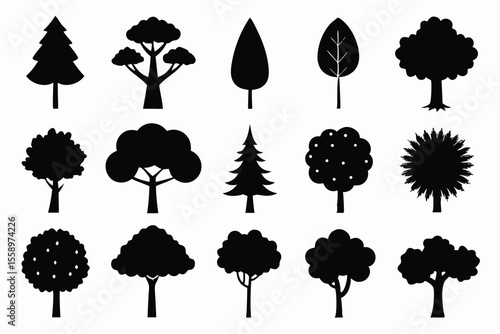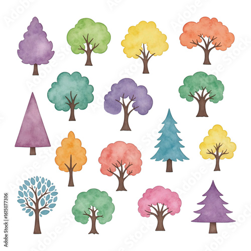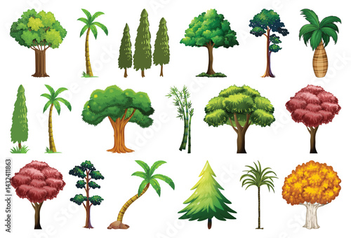 Trees and bushes set, flat vector isolated illustration. Forest, garden trees, shrubs covered with green, yellow, red leaves and stripped of their leaves.