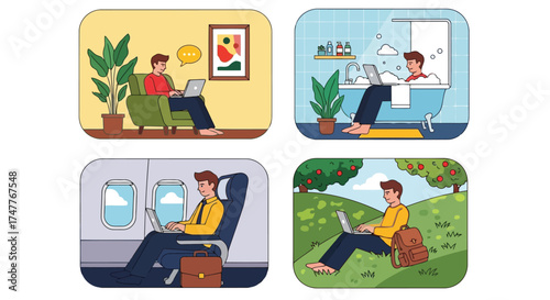 Freelance workers, male, female cartoon character set, flat vector illustration. Happy people working on computer from home office sitting at table, lying on cozy sofa, in hammock, on chaise longue.