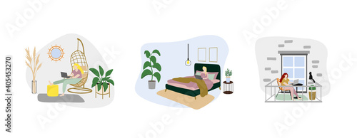 Freelance set. People working from home office, coffee shop, flat vector illustration. Freelancer cartoon characters working, studying in bedroom, kitchen, living room. Remote work, distance education