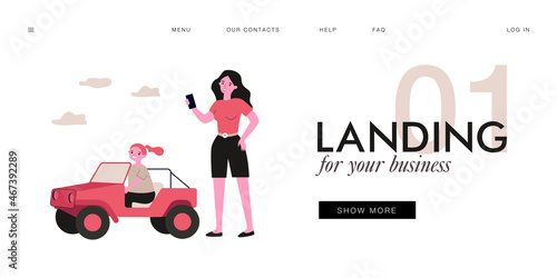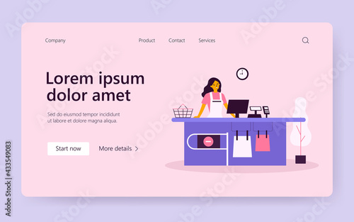 Work at home concept. Freelance girl develops project in home office. Cat sits on a chair. Vector web site design template. Landing page website concept illustration.