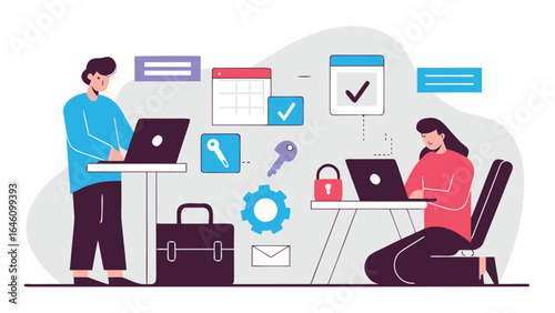 Young man freelancer sitting at table and working on laptop at home office, vector flat illustration. Home workspace with scrum board. Working remotely, freelancing concepts.