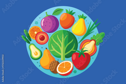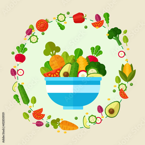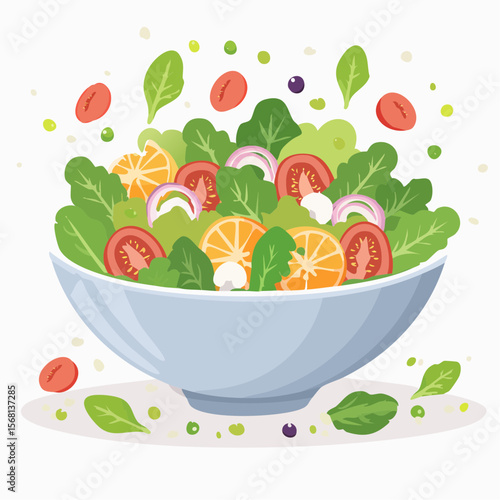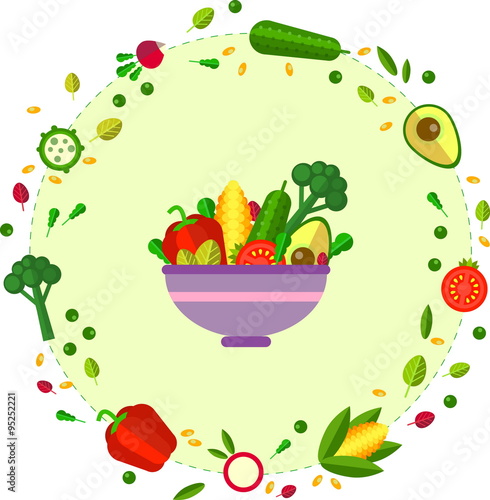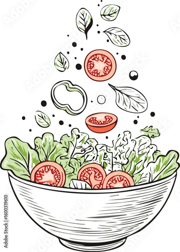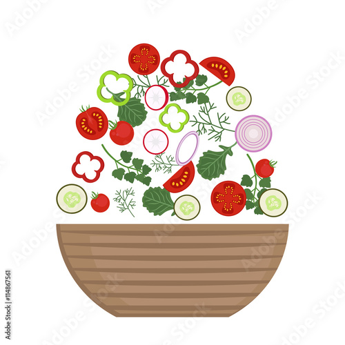 Fresh greek salad of greens and vegetables sprinkled in a deep plate. Salad recipe with lettuce, tomato, greek cheese, onion and olives. Vector hand drawn illustration.