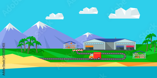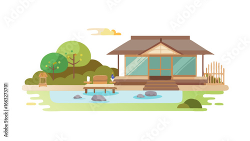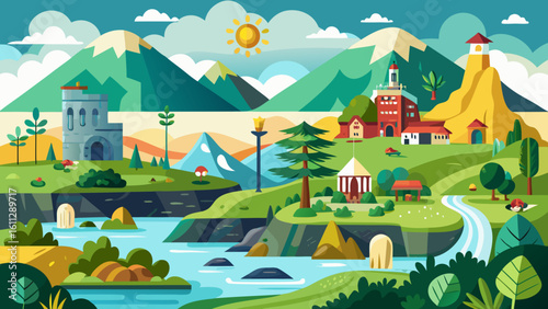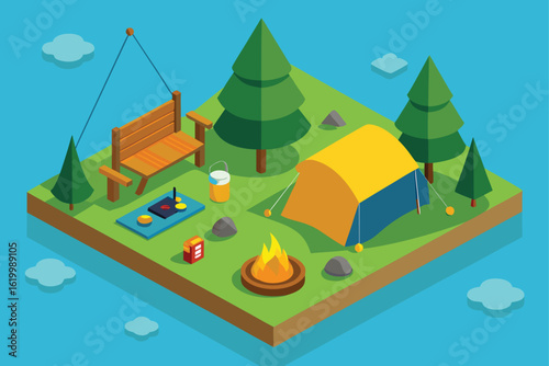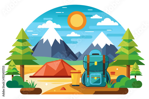 Friends at campsite vector. People outdoors picnic at campsite on nature. Man and woman trailer camper rest on river bank in forest. Traveling in weekend activity illustration
