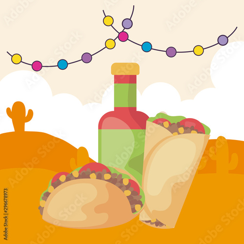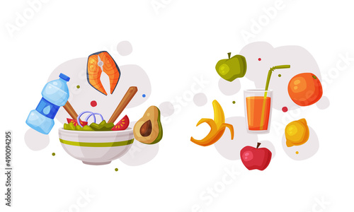 Mixed fruit juice packaging glass bottle, paper cut craft style fresh plum, apricot, apple, pear, citrus fruits, liquid splashes and drops, vector illustration. Healthy natural beverage.