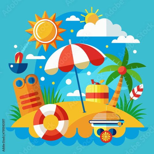 Fruit juice paper cut advertising vector. Promotion poster with healthy drink package over ocean or sea beachside origami style illustration