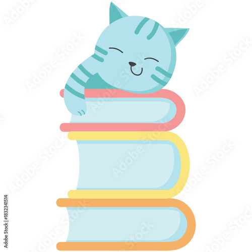 Funny cat animal vector. Lazy kitten sleeping on book stack icon. Cute character napping on textbook pile illustration isolated on white background