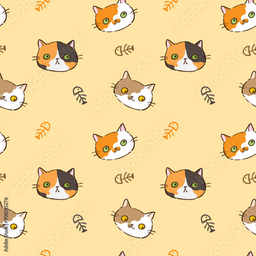Funny cats vector seamless pattern. Creative design for fabric, textile, wallpaper, wrapping paper with cat heads, pet food, fish.