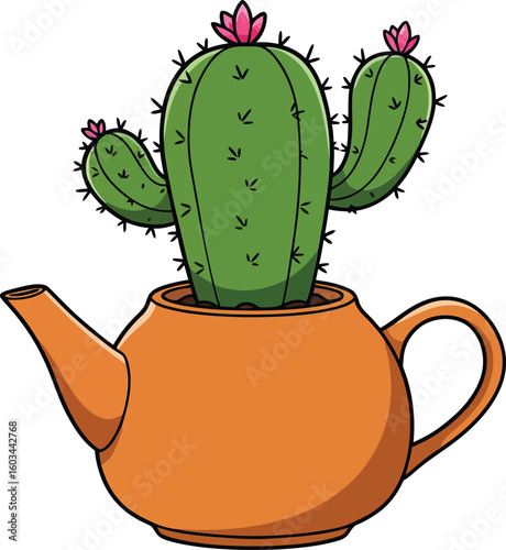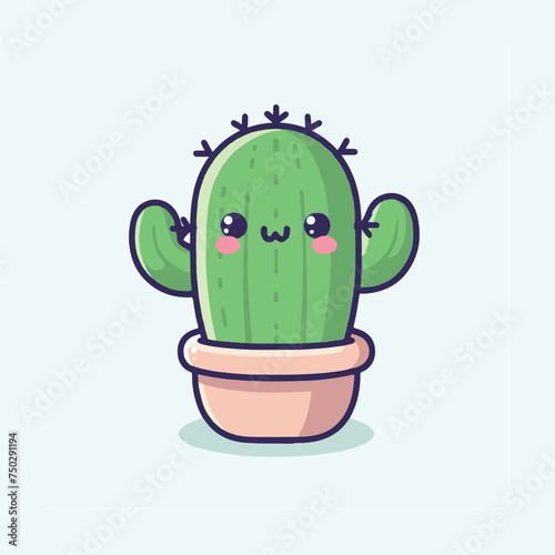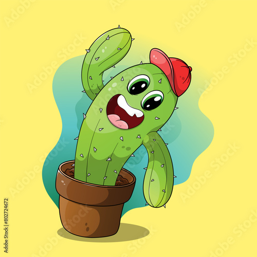 Cactus vector. Funny succulent girl plant mascot with pink blossom flower cartoon illustration. Cute cacti flirty smiling in flowerpot isolated on white background