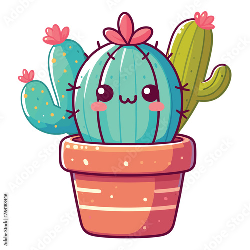 Cactus vector. Funny succulent girl plant mascot with pink blossom flower cartoon illustration. Cute cacti flowerpot isolated on white background