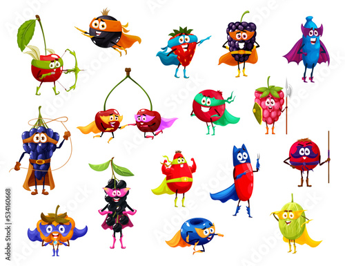 Funny superhero fruit and berry cartoon character set, flat vector illustration. Cute cherry, plum, banana, apple, strawberry, watermelon, lemon, pear, avocado, pineapple in super hero cape and mask.