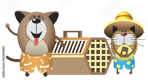 Funny travel pets sitting in luggage bag suitcase vector illustration. Kawai puppy, kitten in Mexican hat holding maracas and serious mouse traveler. Domestic animals tourist